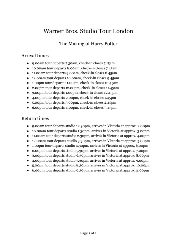 Neem de voucher mee naar het vertrekpunt, binnen in het Colonnade Walk-complex. Zorg dat je op tijd bent, het inchecken sluit 15 minuten voor vertrek. Het duurt ongeveer anderhalf uur om de studio te bereiken, afhankelijk van het verkeer.